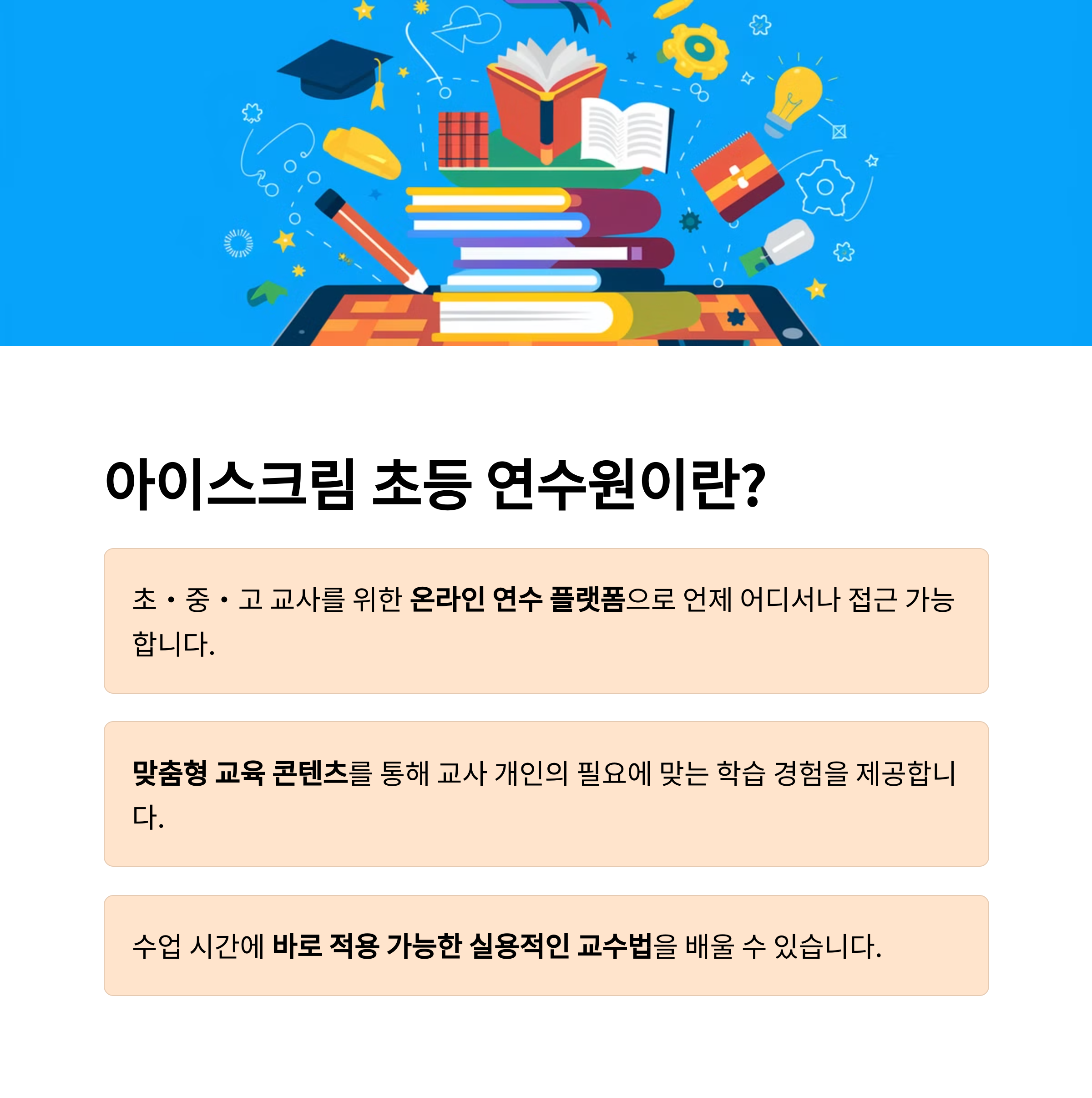 그렇다면, 아이스크림 초등 연수원이 어떤 연수 과정을 제공하며, 어떻게 활용할 수 있는지 함께 알아볼까요?