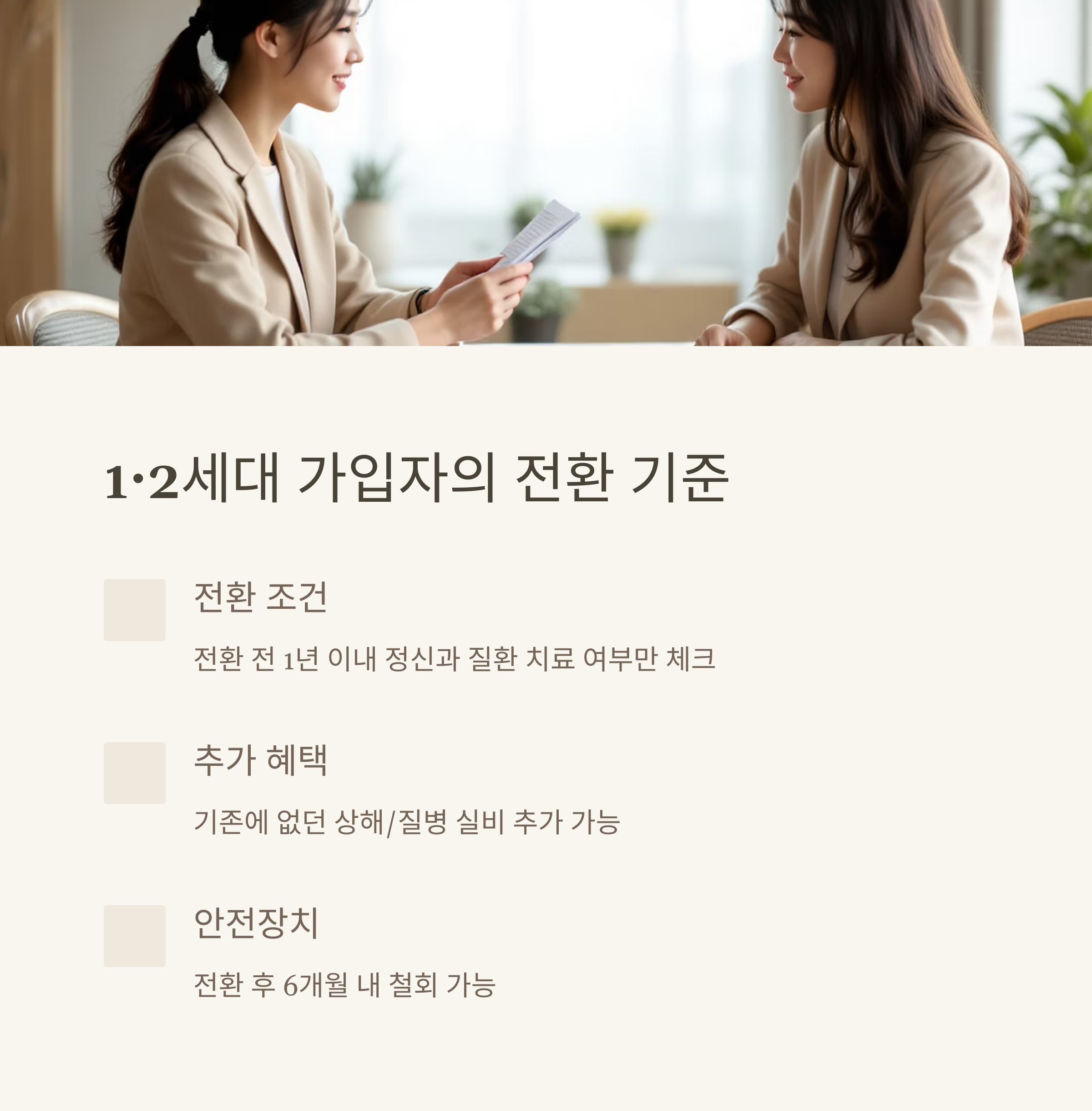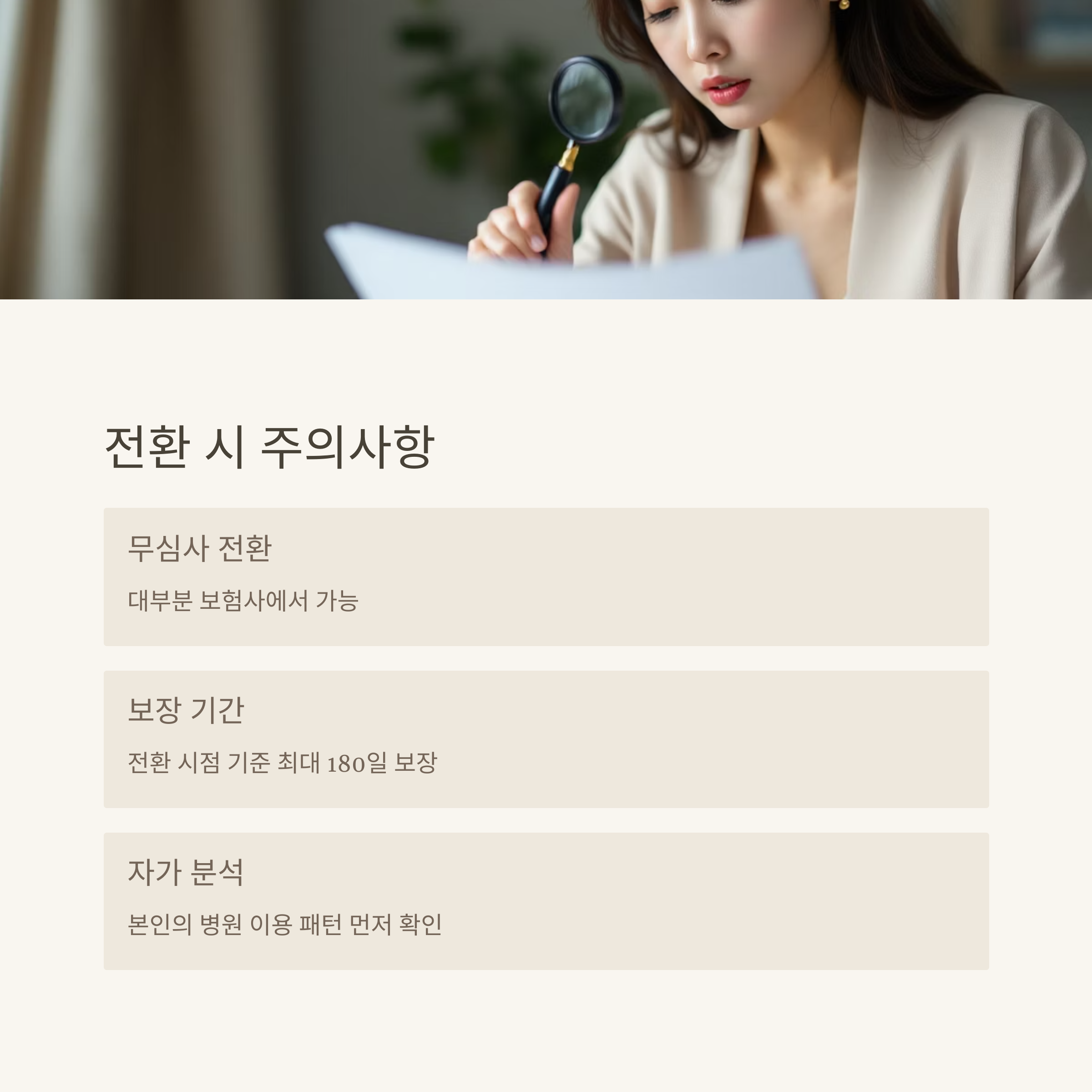 전환은 보험사별 기준이 다를 수 있지만, 대부분 무심사 전환이 가능합니다. 단, 전환 시점 기준 실비보험은 이전 계약 기준으로 최대 180일 보장된다는 점은 꼭 체크하세요.