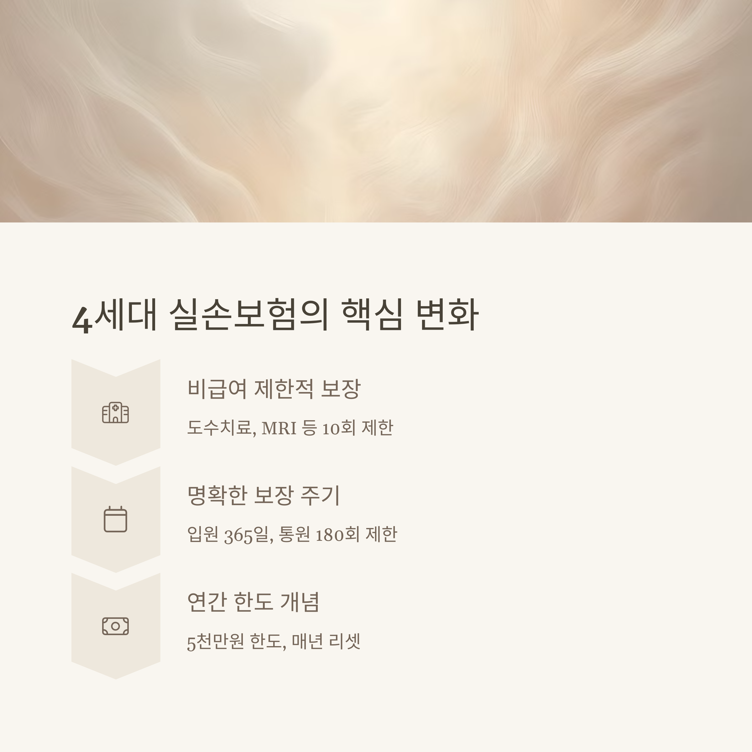 - 4세대(2021~)는 급여 80%, 비급여 70% 보장에 연간 5천만 원 한도 내에서 보상되며, 자기부담률이 더 올라갔습니다.