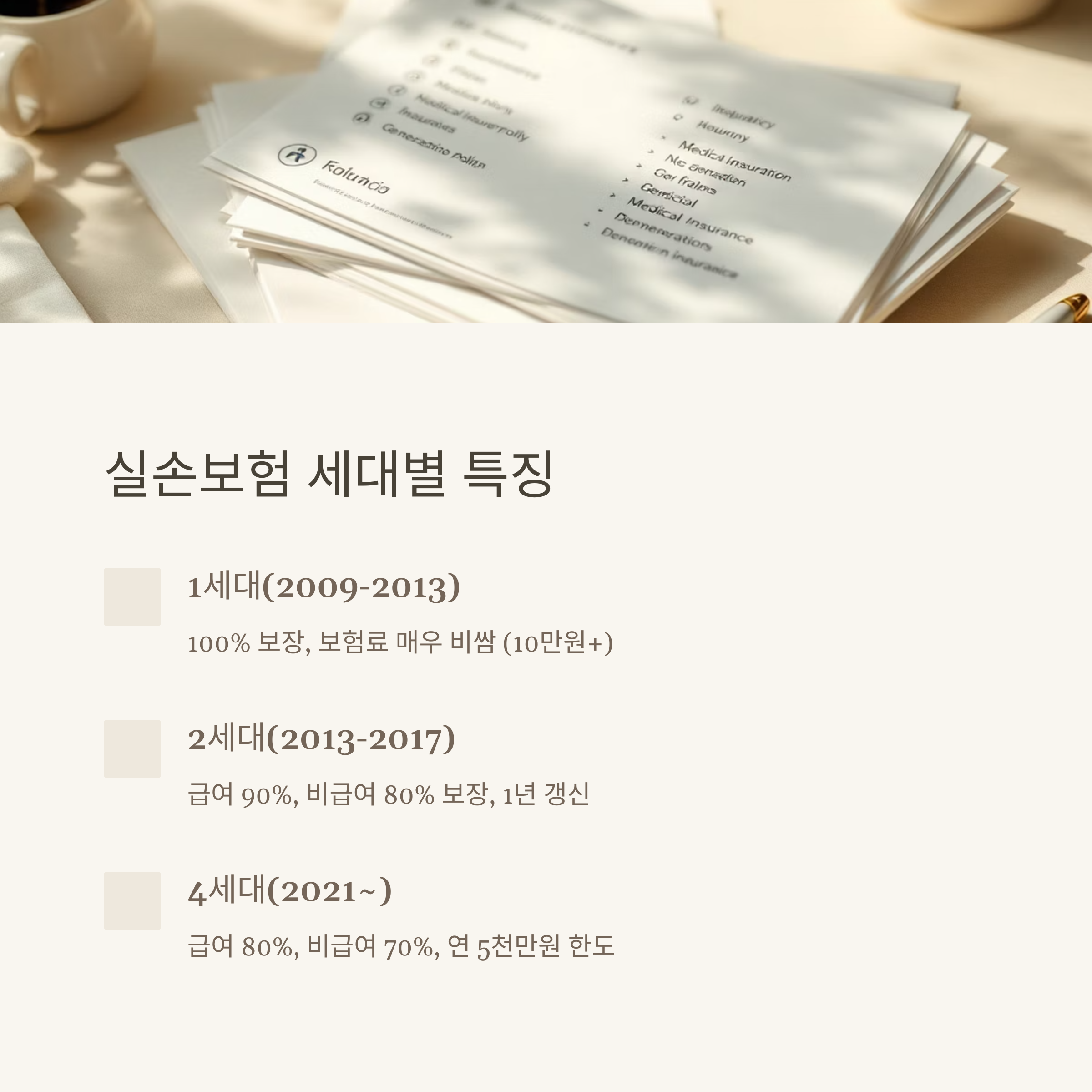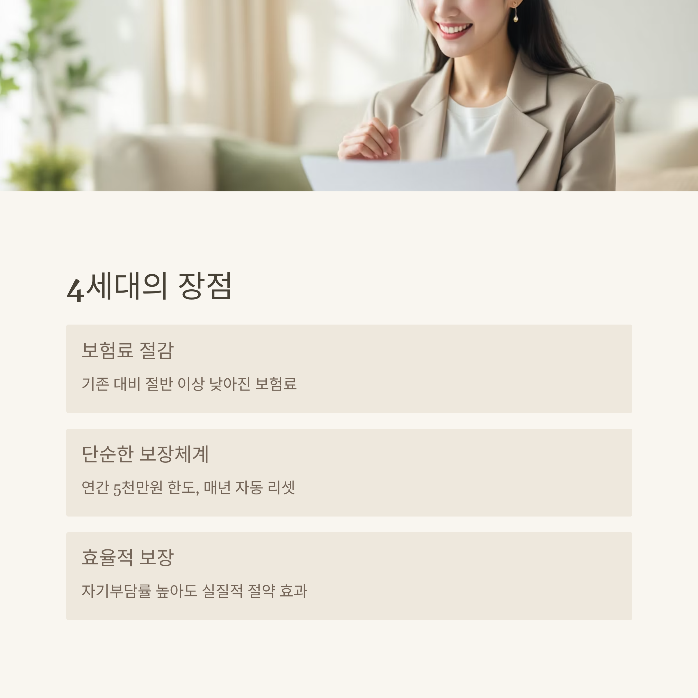 • 4세대(2021~)는 급여 80%, 비급여 70% 보장에 연간 5천만 원 한도 내에서 보상되며, 자기부담률이 더 올라갔습니다.