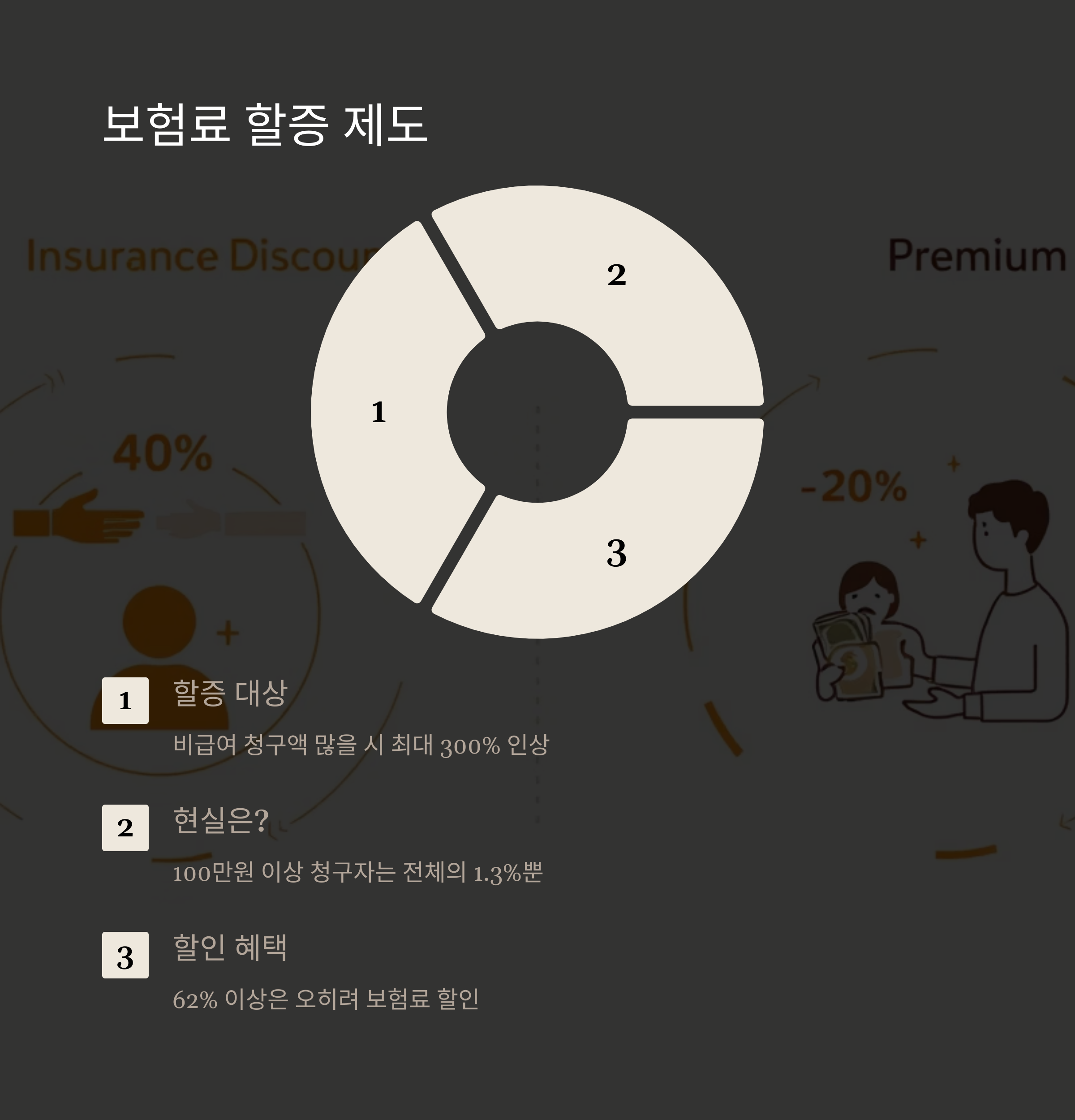 100만 원 이상 청구자 비율은 전체의 1.3%밖에 되지 않고, 62% 이상은 오히려 보험료가 할인됩니다.