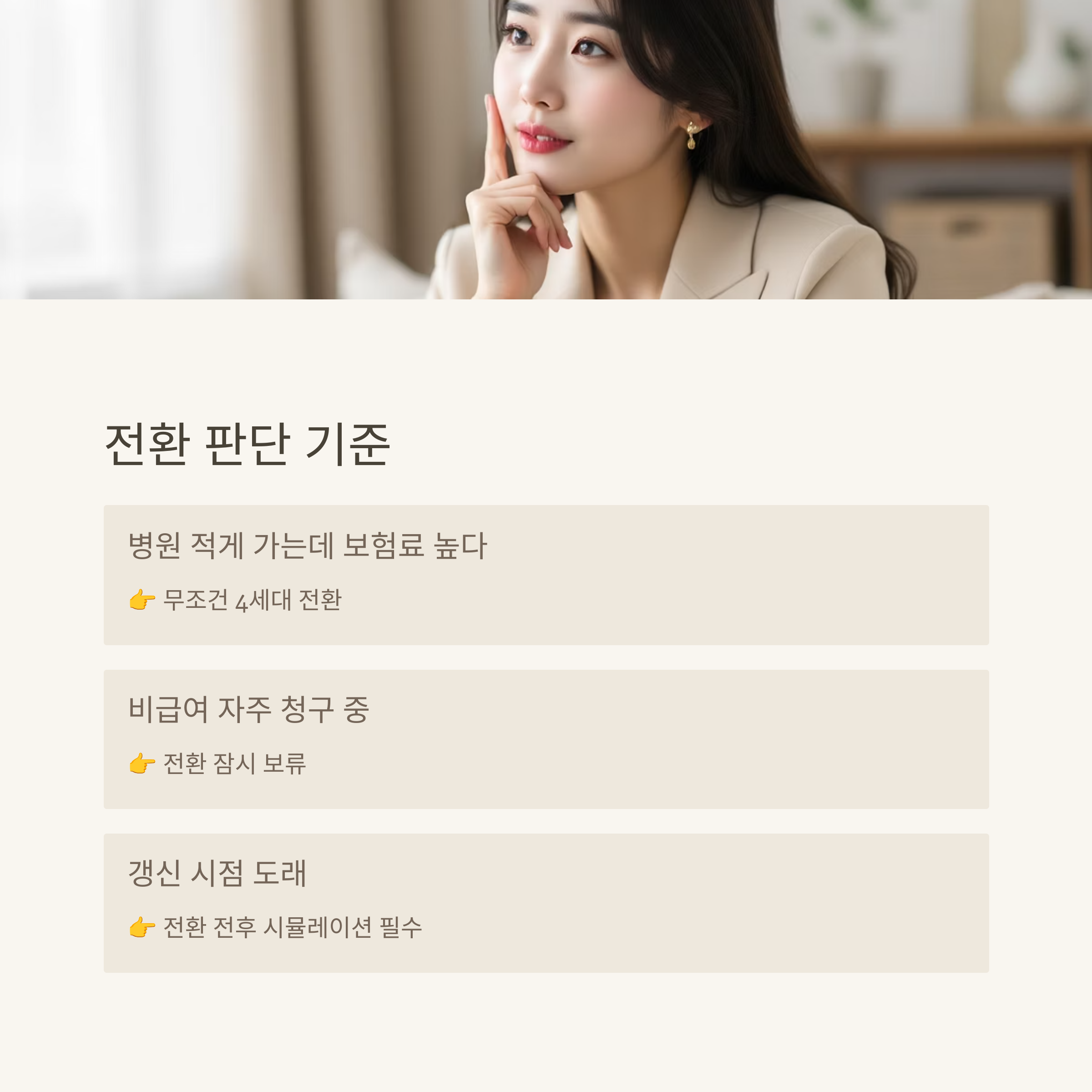 보험사 직원이나 설계사의 설득에만 의존하지 마시고, 본인의 병원 이용 패턴을 먼저 분석해보시는 게 중요합니다. 청구가 거의 없었다면? 4세대 전환이 답입니다. 청구가 많았다면? 당장은 유지하셔야 합니다. 📊