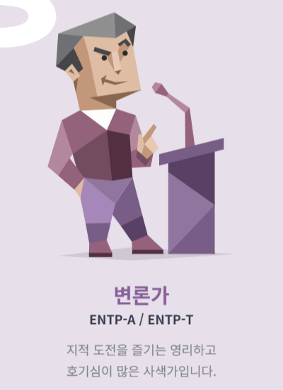 - 주요 특징: ENTP는 창의적이고 논리적인 사고를 통해 새로운 아이디어를 발명하고 도전하는 것을 즐깁니다. 독창적이며 호기심이 많고, 새로운 도전 앞에서 주저하지 않습니다. 다른 사람들과의 토론을 즐기고, 다양한 시각을 받아들이며 끊임없이 발전하려는 자세를 지닙니다.