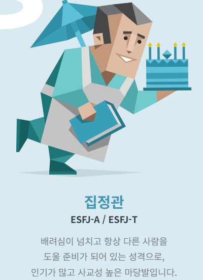 - 주요 특징: ESFJ는 타인을 돌보고 도움을 주는 것을 좋아하며, 사회적 관계를 소중히 여깁니다. 다른 사람들과의 조화를 중시하며, 친절하고 따뜻한 성격으로 많은 사람들에게 사랑받는 경향이 있습니다. 감정에 민감하고 세심하여 타인의 필요를 잘 이해합니다.