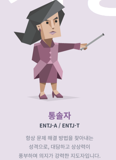 - 주요 특징: ENTJ는 목표를 설정하고 이를 달성하기 위해 철저히 계획을 세우며, 논리적이고 전략적으로 접근합니다. 빠르고 정확한 결단력으로 문제를 해결하며, 리더로서 뛰어난 능력을 발휘합니다. 강한 자신감을 바탕으로 독립적인 의사결정을 하는 편입니다.