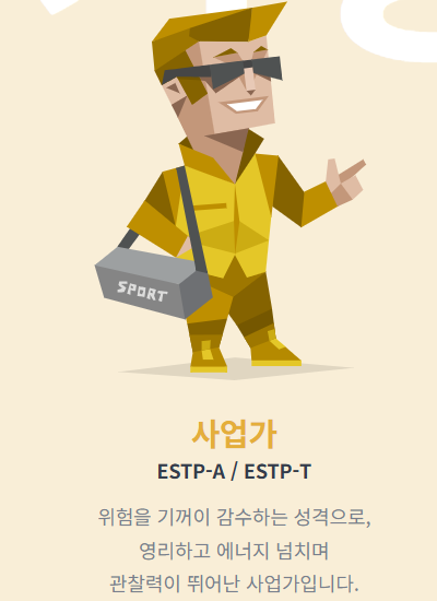 - 주요 특징: ESTP는 활동적이고 모험을 즐기며, 즉흥적으로 문제를 해결하는 능력이 뛰어납니다. 새로운 경험을 추구하고 현재에 집중하는 성향이 강하며, 대체로 상황에 대한 빠른 판단력과 실용적인 접근 방식을 가집니다. 타인과의 상호작용을 즐기며, 사교적인 면모를 보여줍니다.