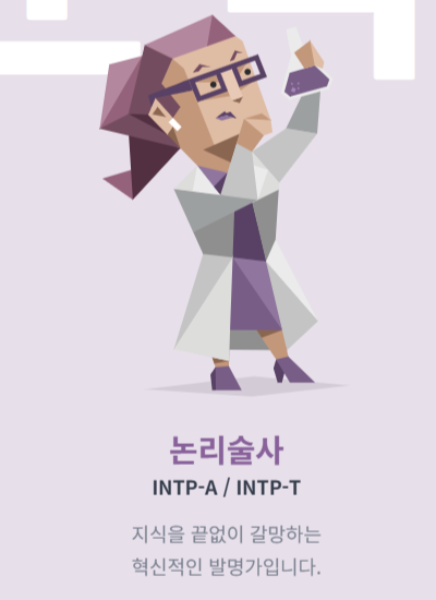 - 주요 특징: INTP는 논리와 지식을 중요하게 여기며, 새로운 아이디어와 개념을 탐구하는 것을 좋아합니다. 대체로 지적인 호기심이 강하고, 복잡한 문제를 분석하며 해결하는 과정에서 만족감을 느낍니다. 독립적인 성향이 강하며, 스스로 탐구하는 것을 좋아합니다.